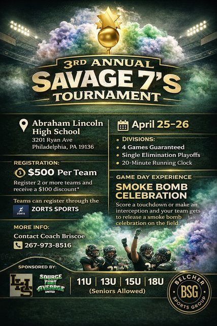 Get ready for Savage 7's third annual 7on7 tournament, where every team is guaranteed four games and a spot in the playoffs. The competition will follow a single-game elimination format, as outlined in our rulebook, which will be distributed to all registered coaches and teams. Join us for an action-packed event featuring full-face painting, a variety of vendors, and more.