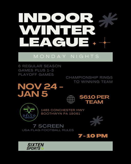 Sixten Sports presents Men's Indoor Flag Football League located in Delco. Conveniently located close to Philadelphia, Delaware, and West Chester. Come play in the area's only officially sanctioned flag football league. Great competition, an amazing facility and trained referees with organized game flow.