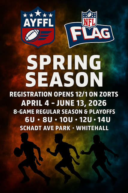 Get ready for an action packed spring season with the AYFFL NFL Flag Football Spring League, the Lehigh Valley’s premier youth flag football experience. Beginning April 4, 2026, athletes from across the region will hit the field at Schadt Ave. Park in Whitehall for fast paced competition, great coaching, and a true NFL Flag game day atmosphere.