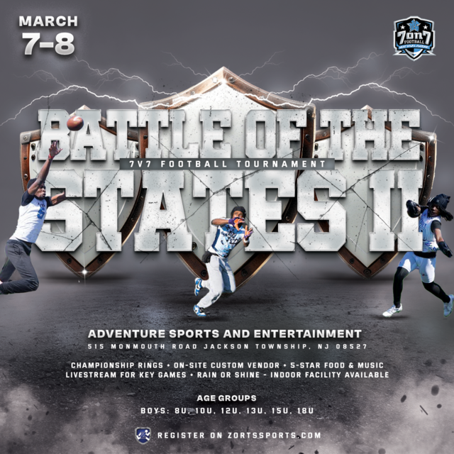 We're excited to host the Battle Of The States 7v7 Tournament, featuring some of the best teams on the East Coast! For the record, It's Jersey Vs. Everyone!