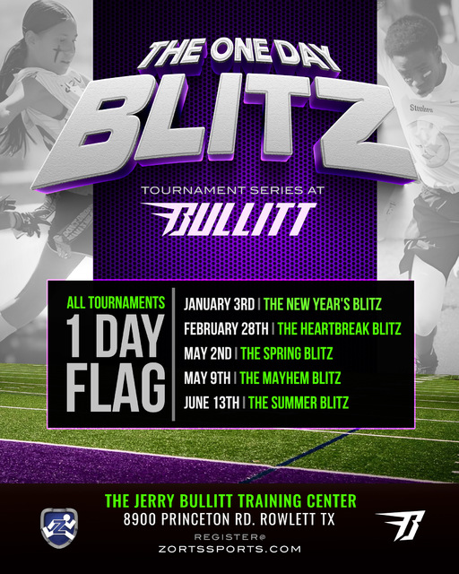 Get ready for The One Day Blitz — a high-energy flag football tournament series hosted at The Jerry Bullitt Training Center in Rowlett, Texas!
