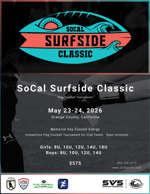 The SoCal Surfside Classic is the premier Memorial Day tournament in the SoCal Premier Circuit, part of the competitive flag football series in Southern California. Designed for elite flag football club teams, the event features a 3-game pool play format, followed by re-seeding of all teams that advance to a single-elimination playoff. This structure ensures that every team gets valuable, competitive experience while vying for divisional championships.