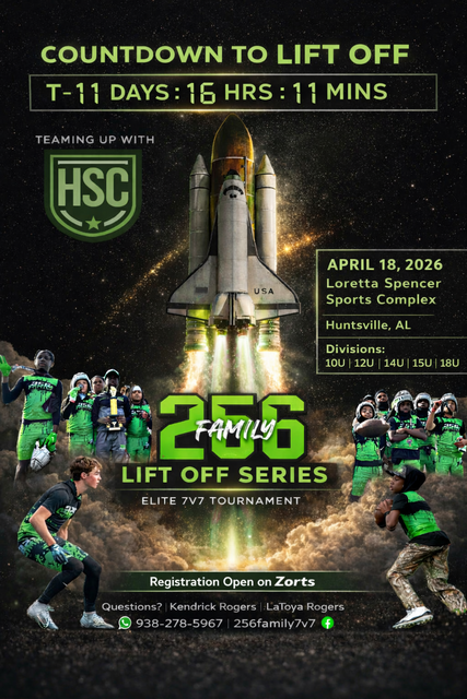 Join us in Huntsville for the launch of the 1st Annual 256 Family Lift Off Series Elite 7v7 Tournament. Expect elite teams, topโtier competition, and that unmatched 256 Family energy.