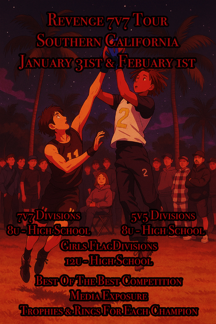 Revenge 7v7 is a high-energy, highly competitive 7-on-7 tournament built for teams who play with grit, swagger, and something to prove. Hosted in the heart of the Inland Empire, this event brings together top programs from across California to battle for respect, exposure, and bragging rights.