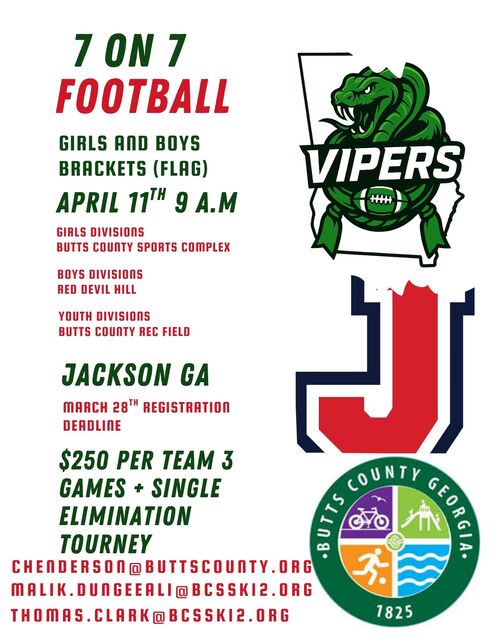 Welcome to the 1st Annual Peach State Showdown presented by The Butts County Rec Department. This will be a one day event. For More Information email malik.dungeeali@bcssk12.org. We have 3 locations for 3 divisions as well as concessions available.