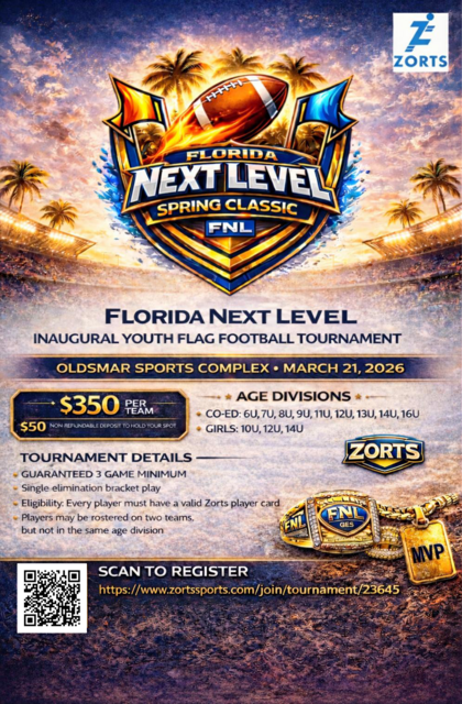 The Florida Next Level Spring Classic is the inaugural FNL flag football tournament, delivering a high energy 5v5 competition and an elevated game-day atmosphere. From the opening snap to the final whistle, teams will experience football at the Next Level- on and off the field!