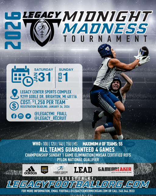 Legacy Football Midnight Madness kicks off the 7v7 season in Michigan. Divisions: 10u, 12u, 14u, 15u, 18u.