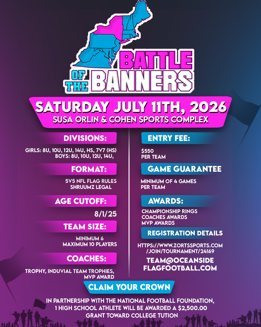 Boys & Girls Divisions: 8U, 10U, 12U, 14U, HS, 7V7 (HS)