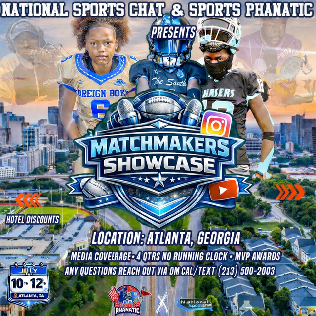 Welcome to the 1st Annual Match Makers Showcase! This event will include some of the best teams from all over the NATION! We will be hosting ages 7U-12U! You don't want to miss this! We are providing kids, parents, coaches and teams with an experience that's unmatched. You will be receiving MAXIMUM EXPOSURE from several platforms attending the event. We will be handing out MVP awards as well! If you have any questions please feel free to reach out to (213) 500-2003 or Instagram DM @nationalsportschats @sportsphanatic_