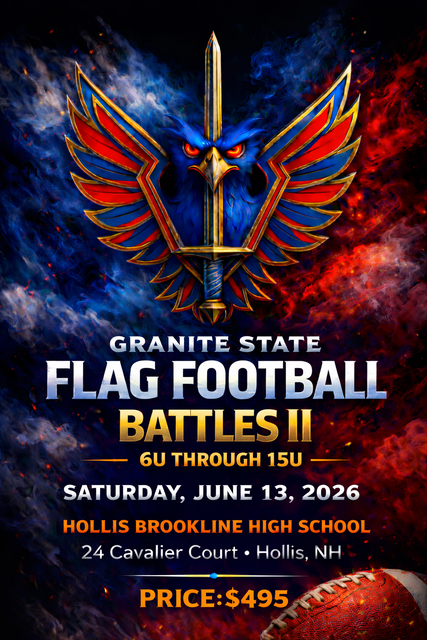 Get ready for the ultimate flag football showdown in New Hampshire—the Granite State Flag Battles II! Hosted by the BattleHawks, this action-packed tournament will bring together the best young athletes from 6U to 15U to compete in a day of fun. Games will be played on both grass and turf fields, challenging teams to adapt and dominate in every environment.