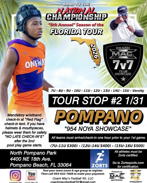 Register your 7v7 team today, text or call Coach Mac @ (954)632-7668