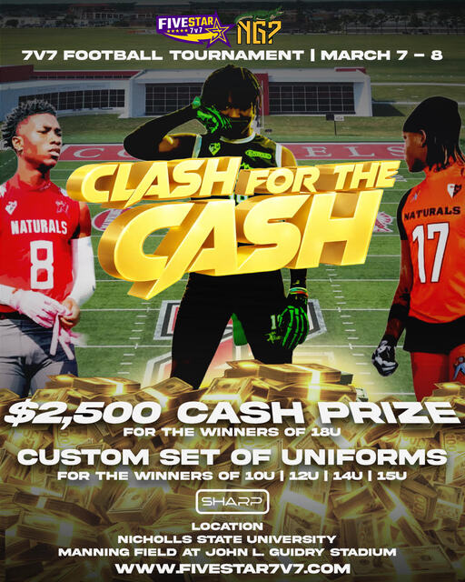 Welcome to the Five Star 7v7 – Clash for the Cash Regional, an elite 7v7 football tournament hosted on a Division I college campus in Thibodaux, Louisiana. This event is designed for high-level programs seeking competitive games, professional operations, and meaningful exposure.