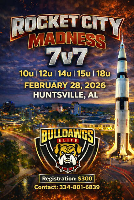 1st Annual RocketCity 7v7 Madness‼️ This tournament will host 10U, 14U, 15U, and 18U 7v7 teams. Registration fee of $300. Multiple teams discount of $50 off each additional teams. Helmets and mouth guards are mandatory. For more information contact 334-801-6839