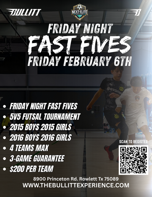 The Fast 5s Futsal Tournament is a premier one-day 5v5 futsal tournament designed for teams looking for high-tempo competition, efficient scheduling, and quality court play. Hosted at The Jerry Bullitt Training Center in Rowlett, Texas, this series provides a consistent, well-run tournament experience for youth teams throughout the season and offseason.