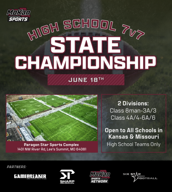 First Ever High School State Championships for 7v7 in Kansas & Missouri! Located at one of the best sports complexes in the area. Paragon Star in Lee's Summit, MO. One day event on Thursday, June 18th!