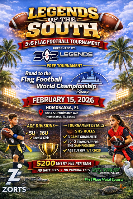 5U – 16U Age cut-off is Jan 1st, 2025 (Same as Flag Football World Championship at Disney