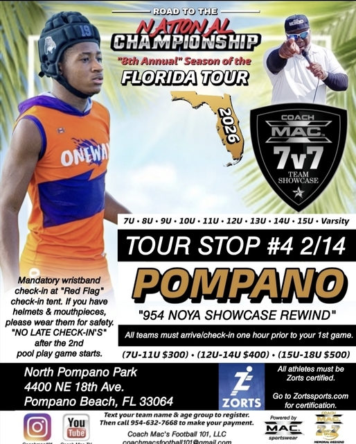 Come join us for another great "Coach Mac" season of 7v7 Football action! Road to the National Championship!!! Coach Mac and his Florida Tour Family are giving you 3 games guaranteed for 7U-14U. 4 games guaranteed 15U & 18U (((NO SENIORS WITH COLLEGE OFFERS ALLOWED OR IF THEY HAVE ALREADY SIGNED THEIR LETTER OF INTENT ON SIGNING DAY))). Starting this year...13U & 14U will now be separated by age if their are enough teams to do it. Coaches must bring their entire team together for wristband check-ins at the "red flag" tent. A coach must be present to check in any athletes who are late. No late check-ins after the 2nd pool play game has started. All athletes must wear his or her wristbands throughout the duration of the tournament. Mouthpieces are mandatory, if you have helmets please wear them. All athletes must wear the same uniform as their teammates. No player(s) from opposing teams is allowed to switch Jersey's or join other teams during the tournament. If we see it, both teams are disqualified from the tournament. Plain white t-shirts, plain black t-shirts, or any plain color t-shirt/compression are not allowed after the 4th week of the Florida Tour. All t-shirts/compression must have the team name or team logo on it. Police detail security will be on site. All athletes must have a Zorts player card to participate in a Coach Mac Event. $10 spectator fee at the gate, kids 7 years old and under are free.