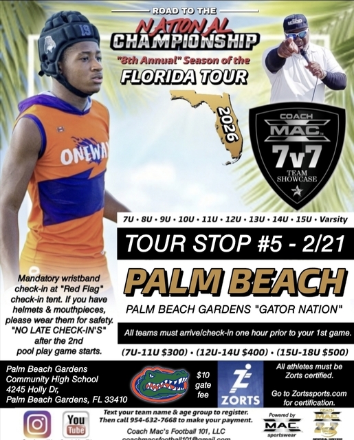 Come join us for another great "Coach Mac" season of 7v7 Football action! Road to the National Championship!!! Coach Mac and his Florida Tour Family are giving you 3 games guaranteed for 7U-14U. 4 games guaranteed 15U & 18U (((NO SENIORS WITH COLLEGE OFFERS ALLOWED OR IF THEY HAVE ALREADY SIGNED THEIR LETTER OF INTENT ON SIGNING DAY))). Starting this year...13U & 14U will now be separated by age if their are enough teams to do it. Coaches must bring their entire team together for wristband check-ins at the "red flag" tent. A coach must be present to check in any athletes who are late. No late check-ins after the 2nd pool play game has started. All athletes must wear his or her wristbands throughout the duration of the tournament. Mouthpieces are mandatory, if you have helmets please wear them. All athletes must wear the same uniform as their teammates. No player(s) from opposing teams is allowed to switch Jersey's or join other teams during the tournament. If we see it, both teams are disqualified from the tournament. Plain white t-shirts, plain black t-shirts, or any plain color t-shirt/compression are not allowed after the 4th week of the Florida Tour. All t-shirts/compression must have the team name or team logo on it. Police detail security will be on site. All athletes must have a Zorts player card to participate in a Coach Mac Event. $10 spectator fee at the gate, kids 7 years old and under are free.