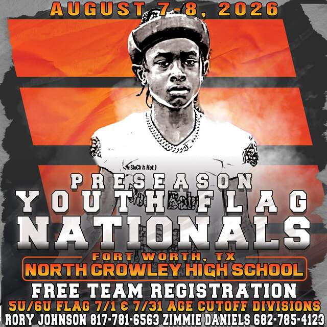 Youth Flag Nationals is a place where all flag 5u 7/1 and 7/31 bday cutoffs and 6u 7/1 and 7/31 cutoffs come to compete for a Flag National Championship. Flag summer games will be held at North Crowley high school and The Nationals will be held in November (Thanksgiving weekend). Please contact us to lock in your spots for the 2026 event