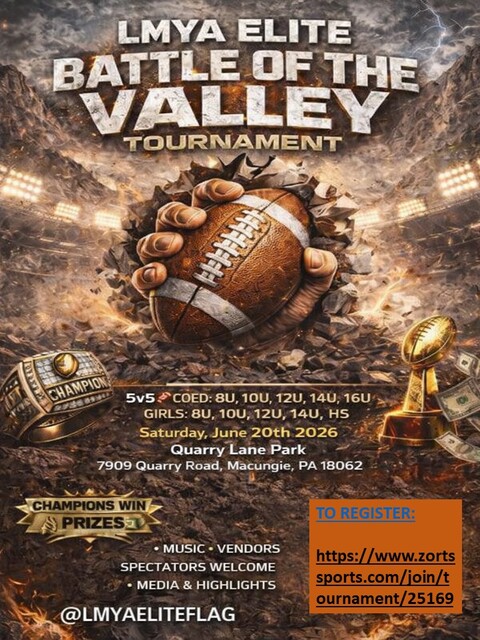 Get ready for the LMYA Battle of the Valley, where top youth flag football teams from across the region come together to compete for bragging rights and championship glory. This high-energy tournament will feature competitive divisions, fast-paced games, and an exciting atmosphere as teams battle it out to prove who truly owns the Valley.