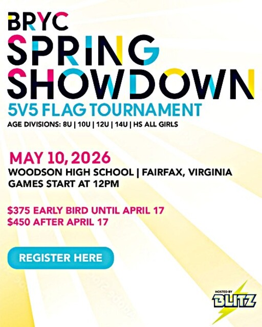 Deposits and payments are non-refundable. If you have paid in full and your team is unable to participate for any reason, we will provide a credit to a future BRYC Flag Football Tournament for the amount paid, minus the $175 deposit. We must receive written notification two weeks prior to the tournament date of May 10th, 2026. If the tournament is impacted by weather, natural disaster, public health emergencies, or outbreaks of communicable disease, we will offer a credit to a future BRYC Flag Football tournament in 2026/2027.