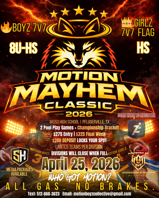 Get ready for one of the most competitive and high-energy youth football events in Central Texas. Motion Mayhem Classic brings together top programs for a one-day 7v7 tournament experience built on competition, culture, and exposure.
