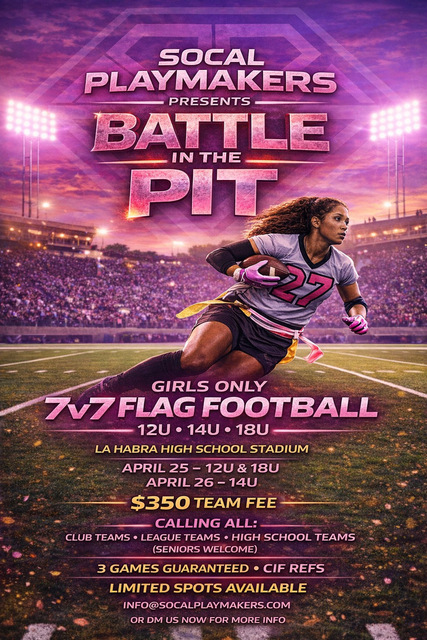So Cal Playmakers presents Battle in the Pit, a girls-only 7v7 flag football tournament hosted at La Habra High School Stadium.