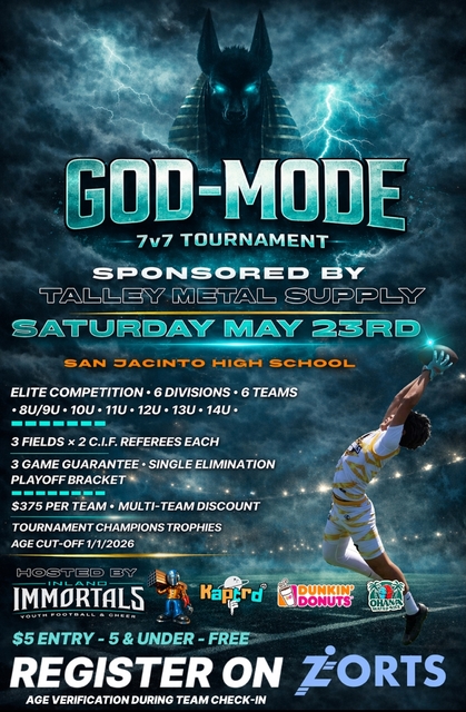 THE INLAND IMMORTALS ARE BRINGING THE INLAND EMPIRE A HIGH QUALITY 7V7 FOOTBALL EXPERIENCE. THIS IS A COED TOURNAMENT AND WELCOME ALL TEAMS.