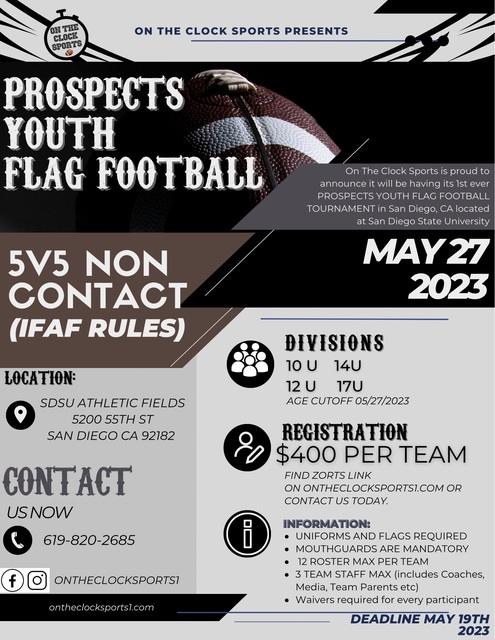 On The Clock Sports is proud to announce it will be having its 1st ever PROSPECTS YOUTH FLAG FOOTBALL TOURNAMENT in San Diego, CA located at San Diego State University. We will be offering several divisions beginning at 10U, 12U, 14U and a 17U division for the High School athletes (Must not turn 18 on or before 5/27/23).